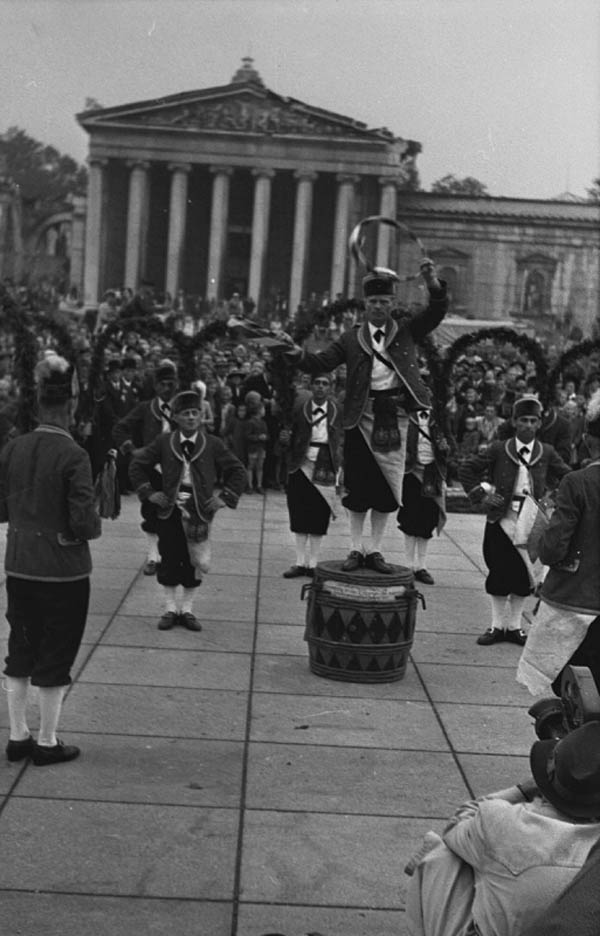 Schäfflertanz auf dem Königsplatz anlässlich des 75. Jahrestages der Gründung des Fachvereins der Schäffler in München. (Fotografie: 6. Juli 1946, Haus der Bayerischen Geschichte)