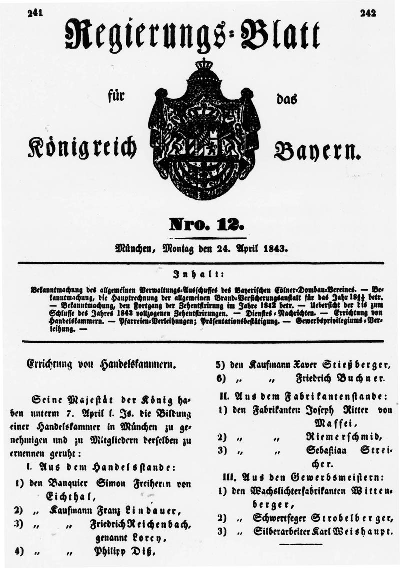 Am 24. April 1843 wurde im Regierungsblatt Nr. 12 die Errichtung von Handelskammern proklamiert. Bereits 1842 hatte König Ludwig I. (1786-1868, König 1825-1848) die rechtlichen Grundlagen dafür gelegt, nach französischem Vorbild in Bayern eine Kammerorganisation zu bilden. Das bayerische Königreich übernahm damit die Vorreiterrolle im Deutschen Bund. (Bayer. Wirtschaftsarchiv)