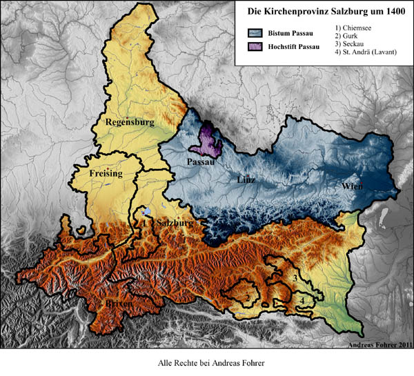 Die Kirchenprovinz Salzburg um 1400. (Bild: Andreas Fohrer M. A., Universität Passau)