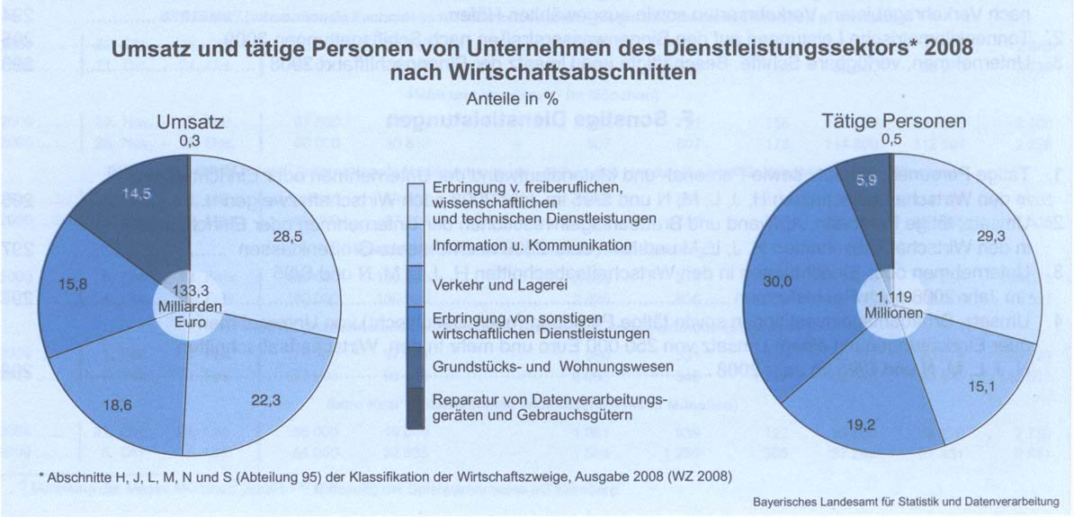 Umsatz und tätige Personen von Unternehmen des Dienstleistungssektors 2008 nach Wirtschaftsabschnitten. (Quelle: © Bayerisches Landesamt für Statistik und Datenverarbeitung, München, 2010, 282)
