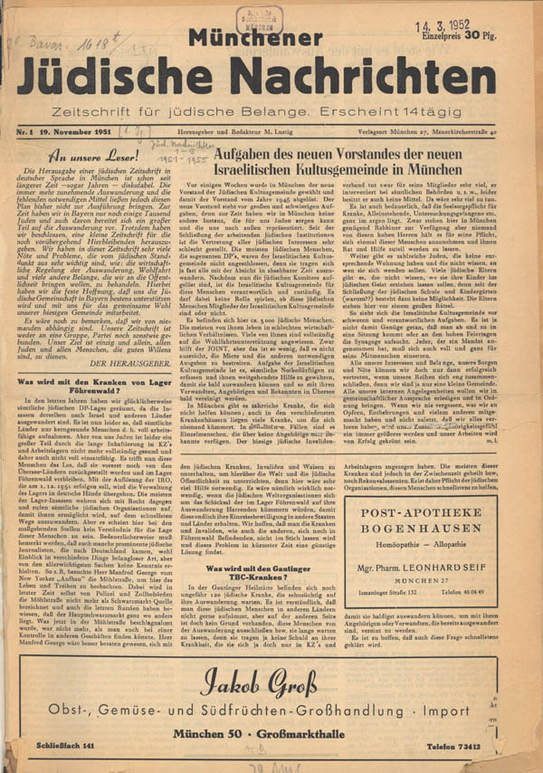 Erste Ausgabe der "Münchener Jüdischen Nachrichten" vom 19. November 1951, Herausgeber und Redakteur Moses Lustig.