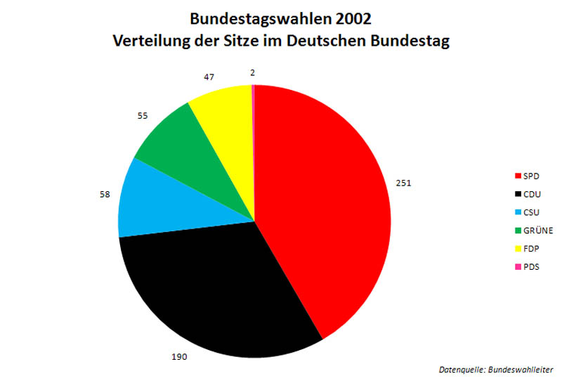 Verteilung der Sitze im deutschen Bundestag nach der Bundestagswahl 2002. (Grafik erstellt anhand der Daten des Bundeswahlleiters)