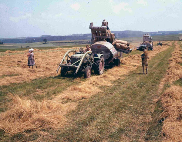 Feldarbeit mit einem Grassamen-Mähdrescher der Gutsverwaltung der Saatzuchtwirtschaft in Steinach (Lkr. Straubing-Bogen), 1963. Die Zahl der Landwirtschaftsbetriebe nahm ab, ihre Größe aber zu. Foto von Erika Groth-Schmachtenberger. (Haus der Bayerischen Geschichte)