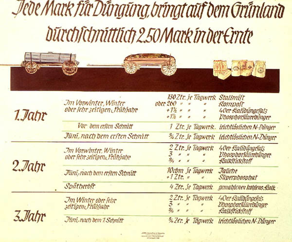 Lehrtafel "Grünland-Düngung" mit der Überschrift "Jede Mark für Düngung bringt auf dem Grünland durchschnittlich 2.50 Mark in der Ernte", 1958. Effizienz war die Maxime nach der Währungsreform von 1948. (Foto: Haus der Bayerischen Geschichte)