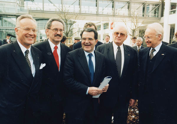 Gruppenbild von Manfred Wutzlhofer (geb. 1944, Geschäftsführer der Messe München GmbH), Christian Ude (SPD, geb. 1947, 1993-2014 Oberbürgermeister der Stadt München), Romano Prodi (geb. 1939, 1996-1998 bzw. 2006-2008 italienischer Ministerpräsident), Roman Herzog (CDU, 1934-2017, 1994-1999 deutscher Bundespräsident) und Edmund Stoiber (CSU, geb. 1941, 1993-2007 bayerischer Ministerpräsident) bei der Eröffnungsfeier der Neuen Messe München am 12. Februar 1998. (Foto: Messe München GmbH)