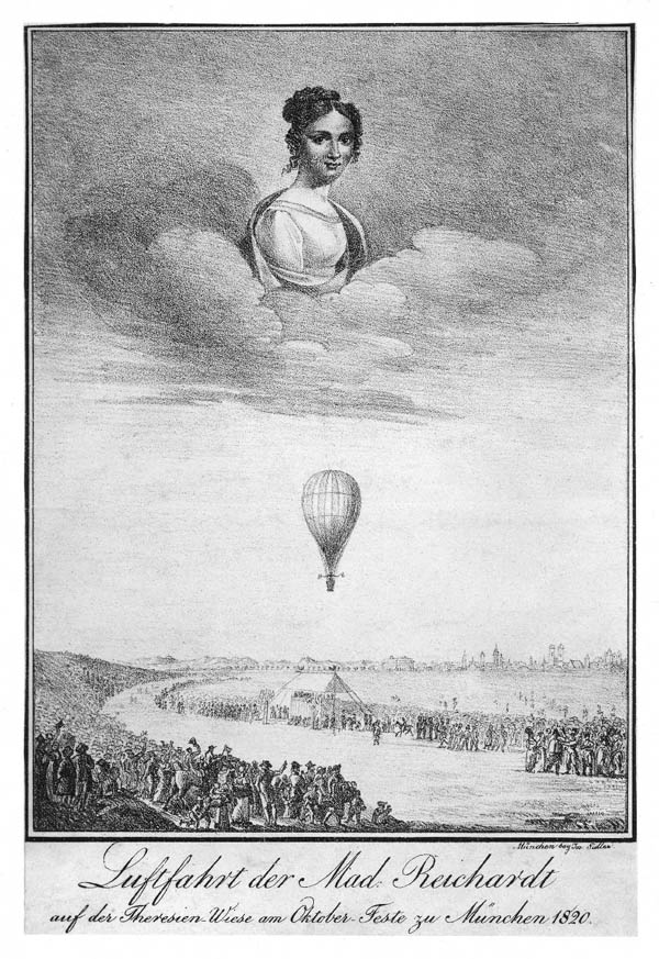 Ballonfahrt der ersten deutschen Ballonfahrerin Wilhelmine Reichardt (1788–1848) auf der Theresienwiese am Oktoberfest in München 1820, Radierung. (Plansammlung des Deutschen Museums)