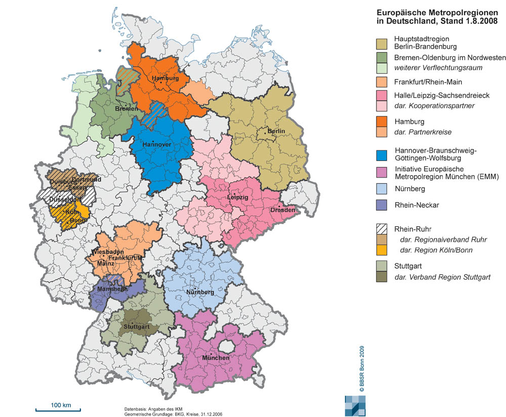 Europäische Metropolregionen in Deutschland, Stand: August 2008. (Grafik: Bundesinstitut für Bau-, Stadt- und Raumforschung im Bundesamt für Bauwesen und Raumordnung, 2009)