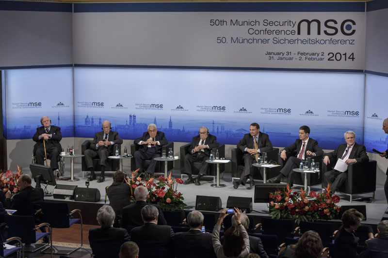 Podiumsdiskussion zur 50 Sicherheitskonferenz im Hotel Bayerischer Hof, 1. Februar 2014. Von links nach rechts: der deutsch Alt-Bundeskanzler Helmut Schmidt (SPD, 1918-2015), der ehemalige französische Präsident Valéry Giscard d'Estaing (1926-2020), der ehemalige US-Außenminister Henry Kissinger (1923-2023), Egon Bahr (SPD, 1922-2015), der polnische Außenminister Radoslaw Sikorski (geb. 1963), der ehemalige britische Außenminister David Miliband (geb. 1965). (Foto: imago stock & people GmbH)