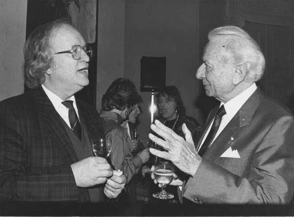 Der künstlerische Leiter der Konzertreihe "musica viva" Jürgen Meyer-Josten (links, geb. 1934) und der Generaldirektor der GEMA Erich Schulze (1913-2017). (Bayerische Staatsbibliothek, Bildarchiv, Fotoarchiv Timpe)