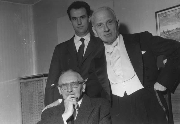 Dirigent Hermann Scherchen (1891-1966), Komponist Luigi Nono (1924-1990) und Violonist Rudolf Kolisch (1896-1978) am 24.1.1958. (Bayerische Staatsbibliothek, Bildarchiv, Fotoarchiv Timpe)