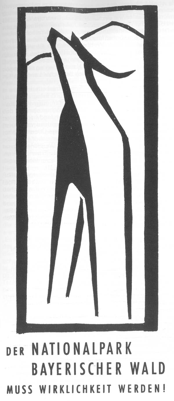 Flugblatt für die Errichtung des Nationalparks Bayerischer Wald (1966), aus: Bayerisches Staatsministerium für Ernährung, Landwirtschaft und Forsten: Nationalpark Bayerischer Wald. Eine Landschaft wird Nationalpark. Grafenau 1993, 103, Holzschnitt von Heinz Theuerjahr. (H. G. Theuerjahr)