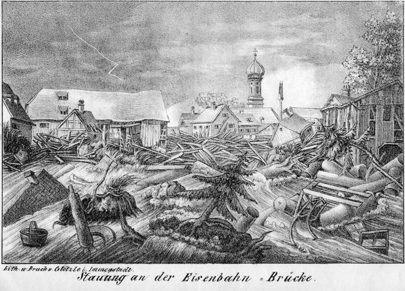 Immenstadt im Allgäu: Am 28. Juli 1873 zerstörte ein Hochwasser in Immenstadt zahlreiche Häuser und richtete auch auf Flur und Feld große Schäden an. Das Bild zeigt das angestaute Wasser an der Eisenbahnbrücke. Im Hintergrund die St. Nikolaus-Kirche. (Bayerische Staatsbibliothek, Porträt- und Ansichtensammlung, port-028391)