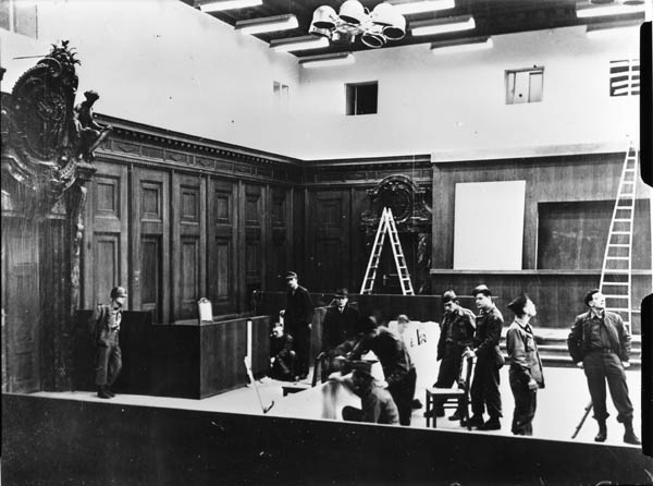 US-amerikanische Soldaten beim Umbau des Schwurgerichtssaals für die Nürnberger Prozesse. (Bayerische Staatsbibliothek, Fotoarchiv Hoffmann)