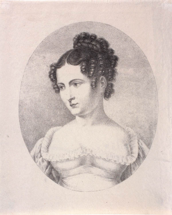 Prinzessin Therese Charlotte Louise von Sachsen-Hildburghausen (1792-1854, Königin 1825-1848). Die Braut des bayerischen Kronprinzen Ludwig (1786-1868, König 1925-1848) ist Namensgeberin der Theresienwiese, auf der seit 1810 das Münchner Oktoberfest stattfindet. Lithographie um 1810, 32 x 26 cm. (Münchner Stadtmuseum, G-MII/582)
