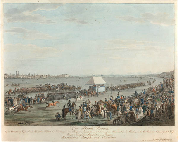 eter Heß, "Das Pferderennen bey der Vermählungs Feyer Seiner Königlichen Hoheit des Kronprinzen von Bayern, veranstaltet am 17ten Octr 1810 auf der Theresens-Wiese bey München von der Cavallerie der National-Garde 34 Klaße. Ihren Königlichen Majestäten von Bayern Maximilian Joseph und Karoline in tiefster Ehrfurcht gewidmet von den Theilnehmern an den October-Festen", 1810, kolorierter Konturenstich. (Münchner Stadtmuseum, G-IIIc/8)