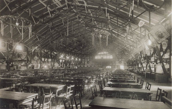 Innenansicht des Augustiner-Zeltes, 1930. Die klassische, im Stil der Bierhallen gestaltete Bestuhlung wich im Laufe der Zeit der heute gebräuchlichen Bierbankbestuhlung. (Augustiner Bräu Wagner KG)