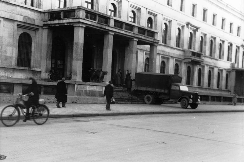Im ehemaligen Verwaltungsbau der NSDAP in München richteten die US-Amerikaner nach Kriegsende den sog. Central Collecting Point (CCP) der US-Zone ein. Hier wurden sämtliche Kunstgegenstände, die von den Nationalsozialisten geraubt bzw. während des Krieges ausgelagert wurden umgeschlagen und - soweit möglich - an ihre usprünglichen Orte verbracht. Heute befinden sich im "Münchner Haus der Kulturinstitute" u.a. das Zentralinstitut für Kunstgeschichte, das auf den CCP zurückgeht. (Bayerische Staatsbibliothek, Fotoarchiv Timpe)