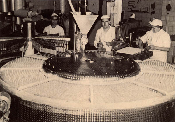 1958 wurde bei Schöller der Rundgefrierer "Rollo 29" der Firma Hoyer angeschafft, mit dem 5.000-7.000 Portionen Eis pro Stunde in Tüten gefüllt werden konnten. (Foto: Theo und Friedl Schöller-Stiftung)