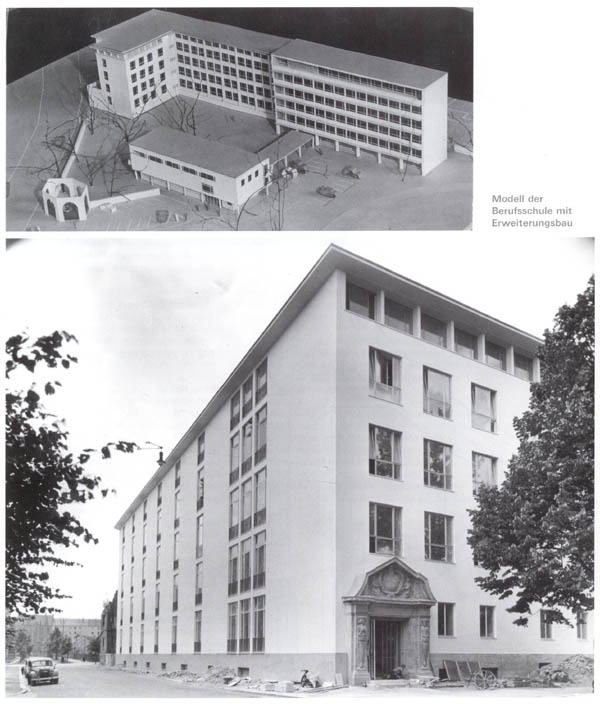 Modell der Berufsschule (o.) mit Erweiterungsbau (u.). (Foto: Städtische Berufsschule für das Hotel-, Gaststätten- und Braugewerbe, München)