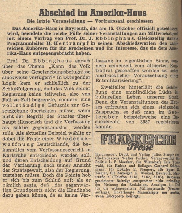 Abschied im Amerikahaus, Fränkische Presse, Nr. 229/9. Jg., Freitag, 02. Oktober 1953.