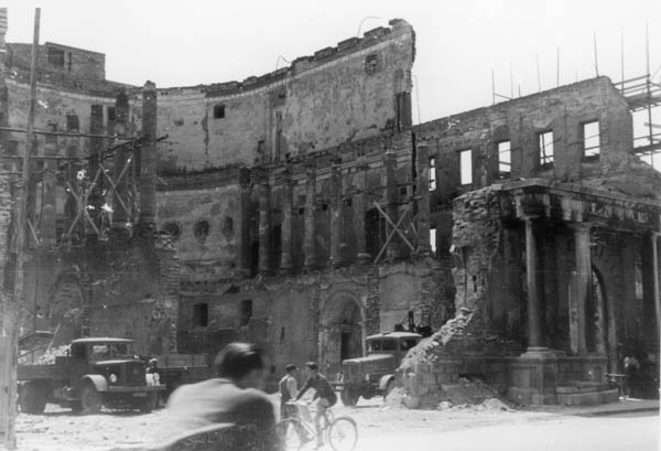 Blick in den zerstörten Konzertsaal des ehem. Odeon, heute: Innenministerium, Wiederaufbau Juni 1951. (Bayerische Staatsbibliothek, Fotoarchiv Timpe)