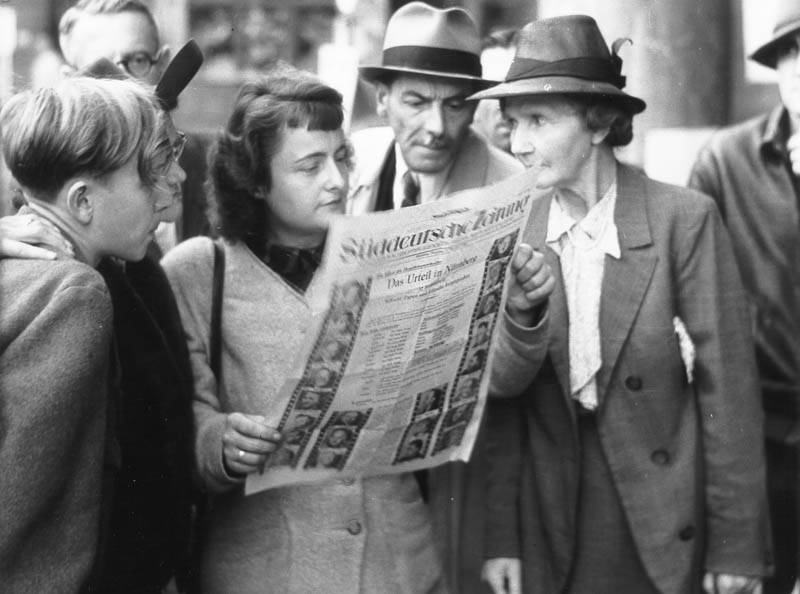 Eine Gruppe von Menschen informiert sich in der Süddeutschen Zeitung vom 1. Oktober 1946 über die Urteilsverkündung im Nürnberger Kriegsverbrecherprozess. (Foto: Süddeutscher Verlag, Bildarchiv)
