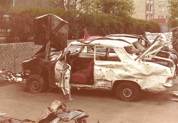 Ergebnis des Anschlags auf das Bayerische Landeskriminalamt (LKA) in München. Am 12. Mai 1972 verübte die RAF auf dem Parkplatz des LKA einen Autobombenanschlag, bei dem fünf Polizeibeamte verletzt wurden und noch im ersten Stock die Fensterscheiben zerbrachen. (Landeskriminalamt)