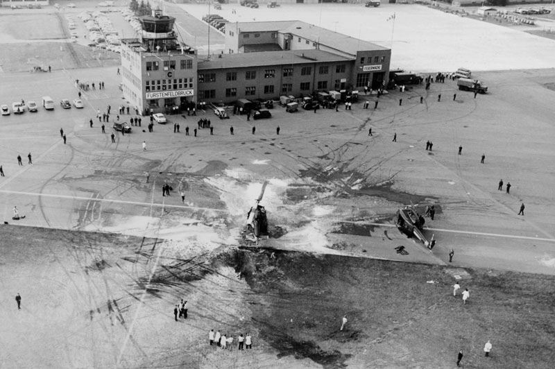 Das tragische Ende der Geiselnahme von München am 5. September 1972: Die palästinensische Terrorgruppe "Schwarzer September" nahm im Olympischen Dorf elf Mitglieder der israelischen Mannschaft als Geiseln. Bei der Geiselnahme und dem späteren Befreiungsversuch auf dem Fliegerhorst Fürstenfeldbruck kamen alle Geiseln und ein deutscher Polizeibeamter ums Leben. Fünf der acht Terroristen wurden in Fürstenfeldbruck getötet. Zu sehen sind die zerstörten Hubschrauber des Bundesgrenzschutzes auf dem Fliegerhorst, mit denen die Entführer und ihre Geiseln nach Fürstenfeldbruck ausgeflogen wurden. (Archiv der Redaktion Bayerns Polizei)