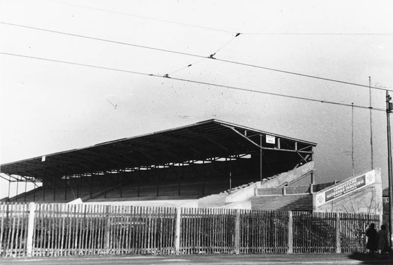 Das Städtische Stadion an der Grünwalder Straße (kurz: Grünwalder Stadion oder nur Grünwalder, "Sechz'ger-Stadion" oder nur "Sechz'ger", früher auch "Sechz'gerplatz") war bis zum Bau des Olympiastadions das größte Fußballstadion in München und wurde entsprechend von den großen Fußballclubs der Stadt als Spielstätte genutzt. Es wurde 1911 vom TSV 1860 errichtet, kam aber 1937 in den Besitz der Stadt München. Das Foto zeigt die Haupttribüne um 1945/1954. (Bayerische Staatsbibliothek, Bildarchiv hoff-65578)
