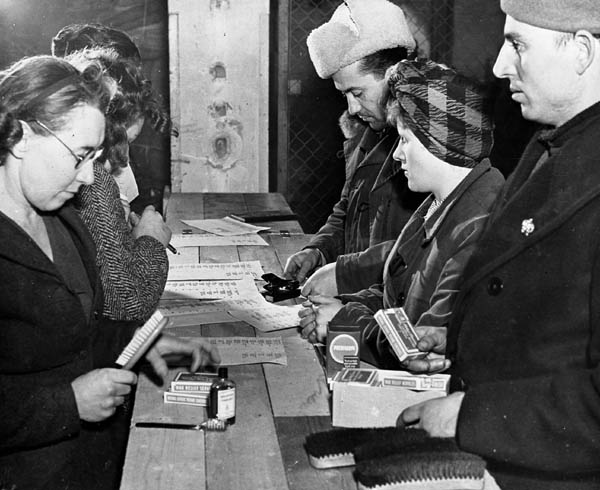 In Versammlungszentren der UNRRA, wie hier in einer ehemaligen SS-Kaserne in München, erhalten die DPs mit wöchentlich ausgegebenen Punktekarten Lebensmittel und andere Alltagsgegenstände, die das Rote Kreuz, verschiedene andere Hilfsorganisationen und die UNRRA beständig herbeischaffen. (United Nations-Archives, S-1058-0001-01-230)