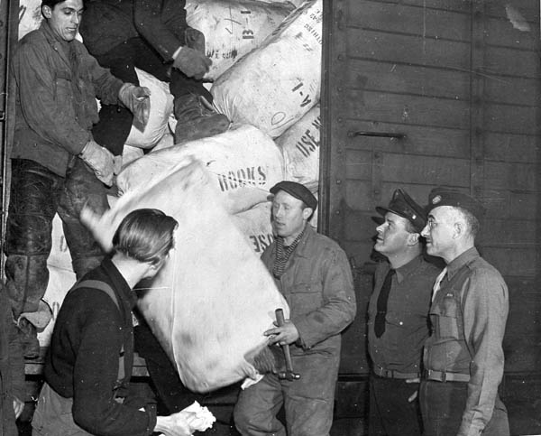 Die erste Bekleidungslieferung der UNRRA aus den USA für die DP-Lager in Deutschland wird vor dem UNRRA-Lager in München abgeladen. Rechts steht Leo W. Hill aus Montana, neben ihm John H. Boyle und weitere Männer, die für die Kleiderausgabe zuständig sind. April 1946. (United Nations-Archives, S-1058-0001-01-229)