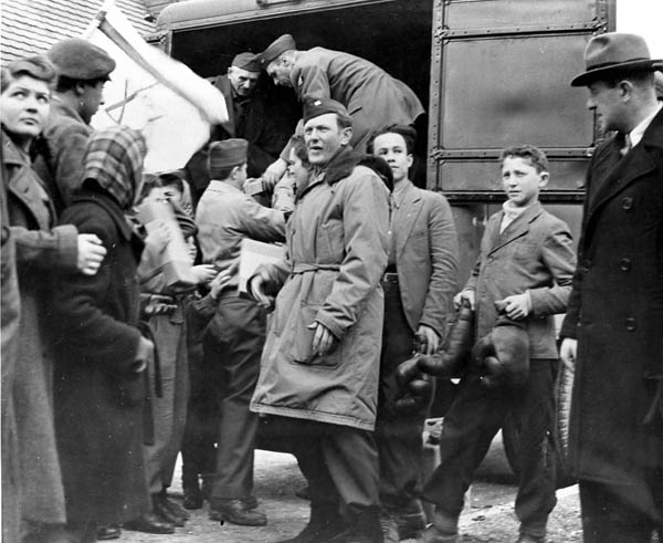 Jüdische DPs erhalten im DP-Lager Wolfratshausen (Lkr. Bad Tölz-Wolfratshausen) Lebensmittelrationen von der National Catholic Welfare Conference (NCWC). Im Hintergrund weht die jüdische Flagge. Im Vordergrund: Horace Marsten, Vertreter der B'nai Brith und der American Jewish Conference. Im Hintergrund verteilt (rechts) Francis X. Mayers Vorräte an die Wartenden. (United Nations-Archives, S-1058-0001-01-381)