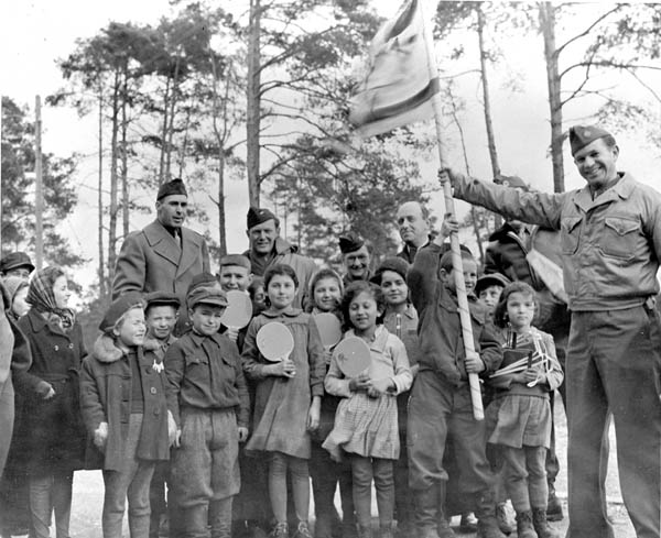 Jüdische Kinder im DP-Lager Wolfratshausen präsentieren sich mit neuem Spielzeug, das ihnen die National Catholic Welfare Conference überbracht hat. Der stellvertretende Lagerdirektor Julius Mintzer schwenkt derweil die jüdische Flagge. (United Nations-Archives, S-1058-0001-01-119)