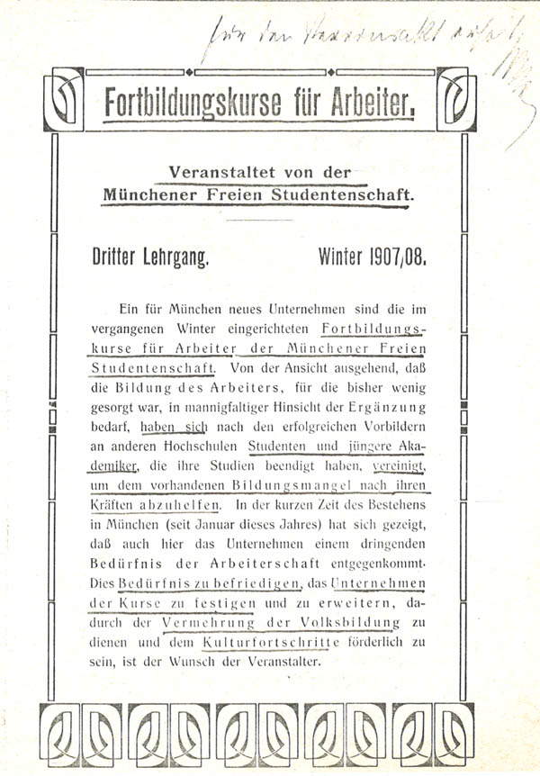 Werbezettel für den Forbildungskurs für Arbeiter, veranstaltet von der Münchner Freien Studentenschaft. Dritter Lehrgang Winter 1907/1908.