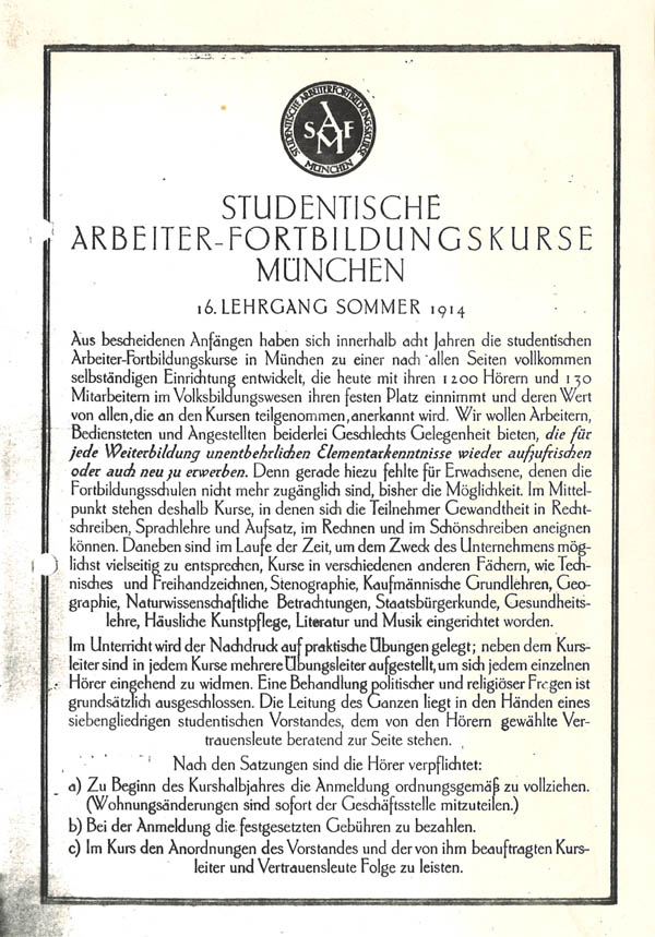 Studentische Arbeiter-Fortbildungskurse München, 16.Lehrgang, Titelseite des Lehrplans für das Sommerhalbjahr 1914. (Universitätsarchiv München, Sen. 366 b/2)