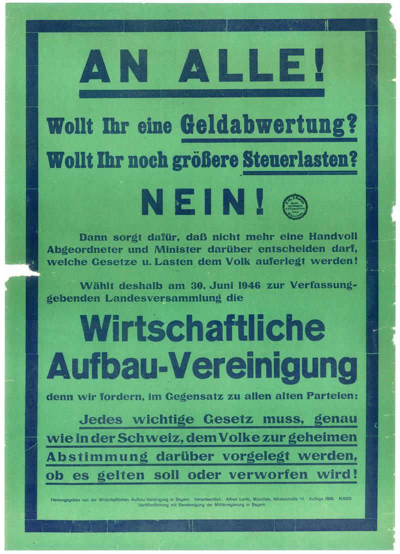 Wahlplakat der WAV anläßlich der Wahl zur Verfassungsgebenden Landesversammlung am 30. Juni 1946. (HStA, PS 26371)