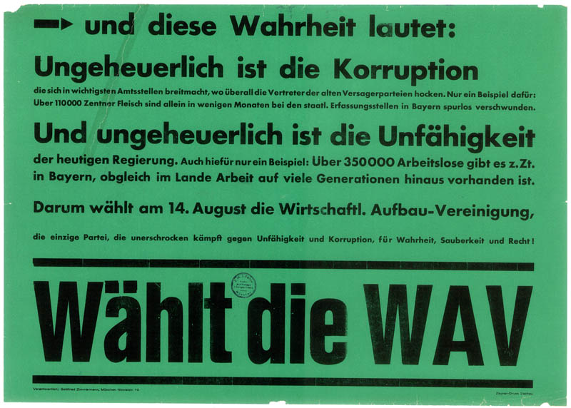 Wahlplakat der WAV anläßlich der Bundestagswahl am 14. August 1949. (HStA, PS 26376)