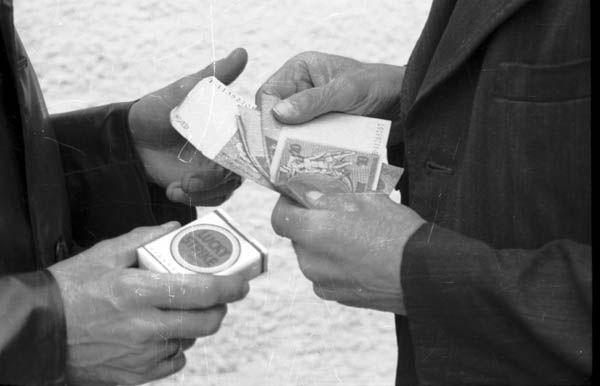 Alltag Schwarzmarkt: Ein Händler verkauft auf dem Münchner Schwarzmarkt eine Schachtel Zigaretten gegen die fast wertlos gewordene Reichsmark. (Bayerische Staatsbibliothek, Fotoarchiv Fruhstorfer)