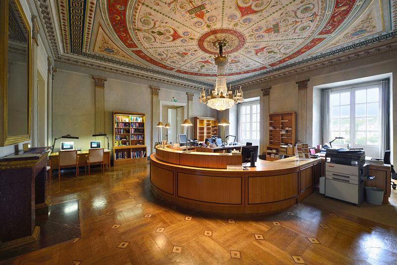 Landesbibliothek Coburg: Die Landesbibliothek ist im Schloss Ehrenburg untergebracht. Dort nutzt sie weite Teile der Anlage, insbesondere den Renaissance-Flügel. Dort ist bspw. im pompejanischen Saal die Ausleihe untergebracht. (Foto: M. Nehab)