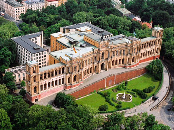 Die Luftaufnahme zeigt das Maximilianeum. Unter der Rasenfläche wurde 1993 eine Tiefgarage errichtet. Das Gelände des Maximilianeums ist von einer Ringstraße umschlossen, die eine Vergrößerung des Bauwerks unmöglich macht. (Bildarchiv Bayerischer Landtag)