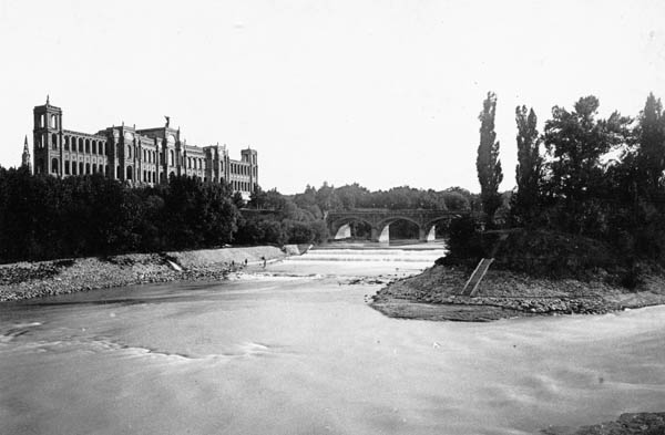 Ansicht des bald nur mehr als "Maximilianeum" bezeichneten Bauwerks aus nördlicher Richtung. Rechts im Bild die Nordspitze der Münchner Praterinsel, von der aus man über die ebenfalls gut erkennbare Maximiliansbrücke zum Maximilianeum gelangte. Aufnahme ca. 1860/1870. (Bayerische Staatsbibliothek, Portrait- und Ansichtensammlung)
