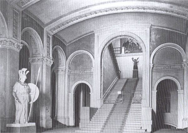 Situation der Eingangshalle des Maximilianeums mit Blick in das Treppenhaus, über das die Gemäldegalerie im ersten Obergeschoss erreicht werden konnte. Links im Bild eine Statue der Athena, auf dem Treppenabsatz eine Statue der Nike. (Bildarchiv Bayerischer Landtag)