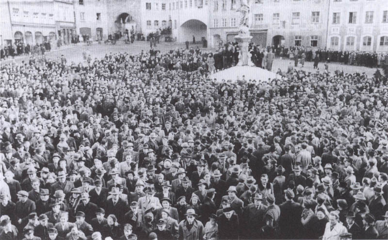 Etwa 3000 Menschen demonstrieren am 7.1.1951 am Landsberger Hauptplatz gegen weitere Hinrichtungen im dortigen War Criminal Prison. (Privatarchiv Heinrich Pflanz)