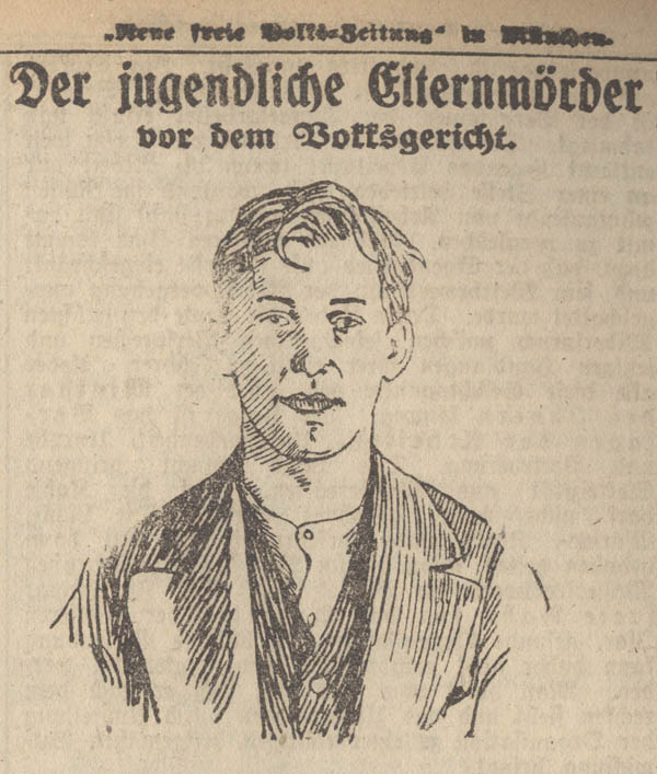 Holzschnitt des geständigen Mörders Josef Apfelböck (1903-nach 1936) im Rahmen eines Artikels zum Prozessbeginn. Neue Freie Volkszeitung, 26. November 1919.