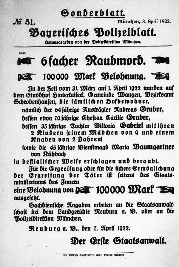 Sonderblatt der Polizeidirektion München im Mordfall Hinterkaifeck. (Staatsarchiv München, Pol. Dir. 8091b)