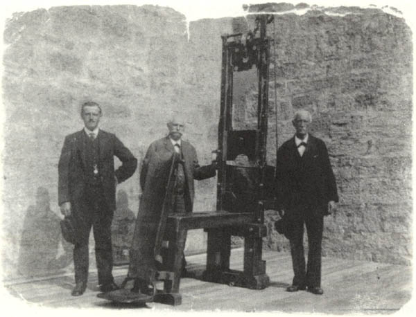 Der Scharfrichter Reichhardt mit Gehilfen an seinem Arbeitsplatz im Gefängnis Stadelheim um 1910. (in: Reinhard Heydenreuter, Kriminalgeschichte Bayerns Von den Anfängen bis ins 20. Jahrhundert, Regensburg 2008, 295)