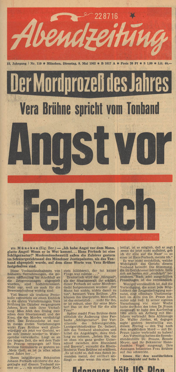 "Vera Brühne spricht vom Tonband". Berichterstattung über den Prozess im Mordfall Otto Praun. (Abendzeitung vom 8. Mai 1962, 15. Jg., Nr. 110)