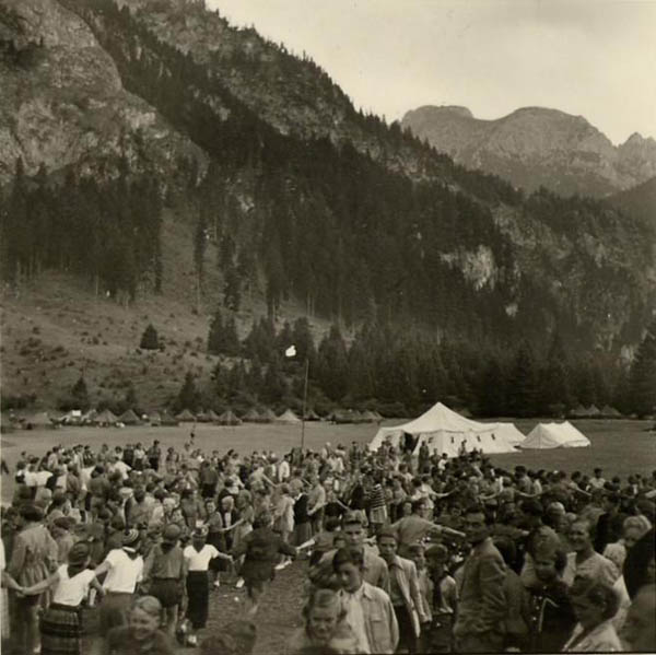 Blick über das Zeltlager des internationalen Jugendtreffens "Falkenstaat Junges Europa", das vom 6. Juli bis 31. August 1952 rund 10.000 Teilnehmer nach Schwangau (Lkr. Ostallgäu) lockte. Es war das erste Camp des "International Falcon Movement" (IFM) in Deutschland. (Foto: Roger Kern, Lorient)