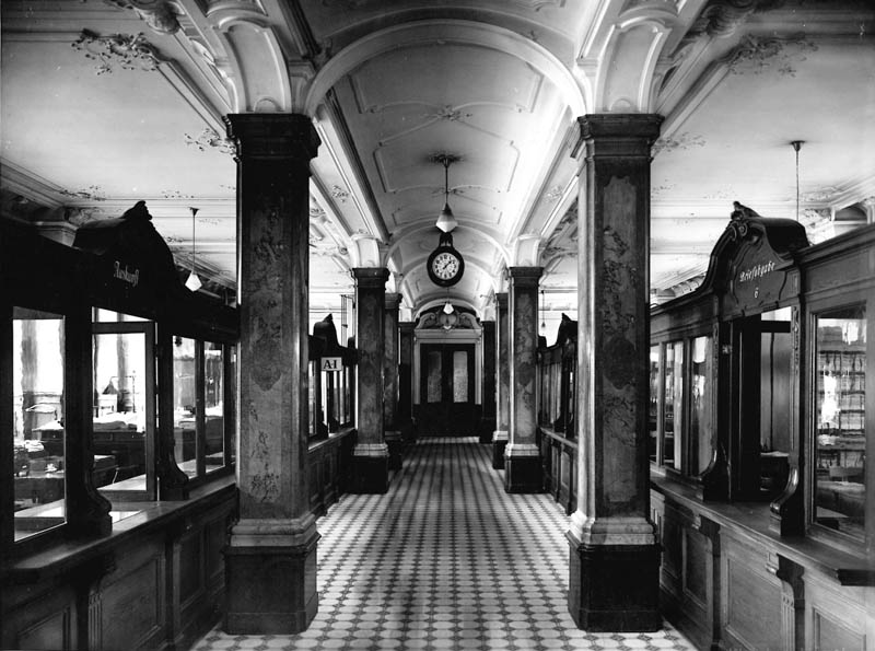 Die ursprünglichen Gasträume des Café Metropol wurden im Zuge der Innenraumgestaltung 1898/1899 in großzügige Bankgeschäftsräume umgebaut. Zu beiden Seiten des Säulenganges befanden sich die Schalter- und Arbeitsräume. (Foto: Archiv der Münchner Bank eG)