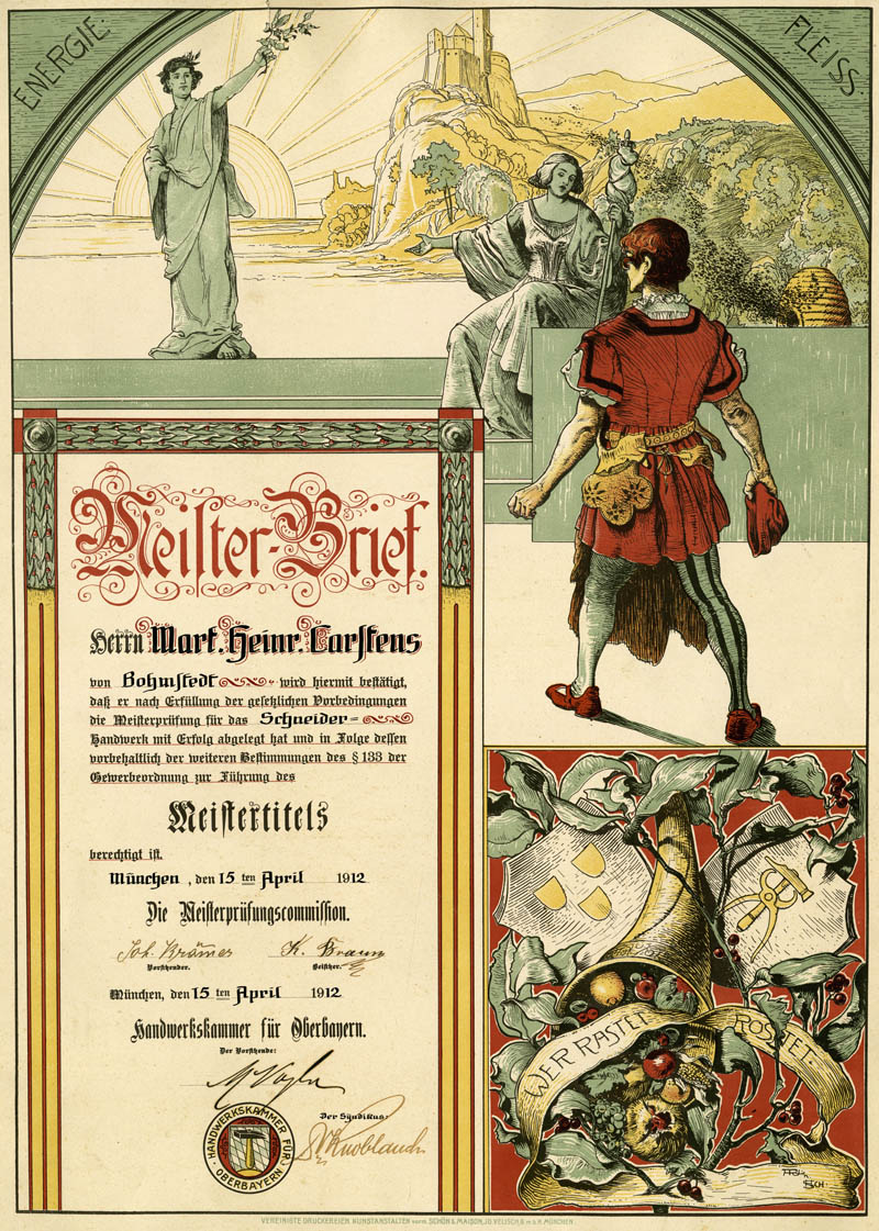 Meisterbrief der Handwerkskammer für Oberbayern für den Schneider Martin Heinrich Carstens, 15.4.1912: Mit der Verleihung des Meisterbriefs wurde den ehemaligen Gesellen nach intensiver Vorbereitung und Prüfungsphase der höchste Abschluss im Handwerk verliehen. Damit wurde ihnen gestattet, sich mit einem selbständigen Gewerbe niederzulassen. (BayerischesWirtschaftsarchiv)